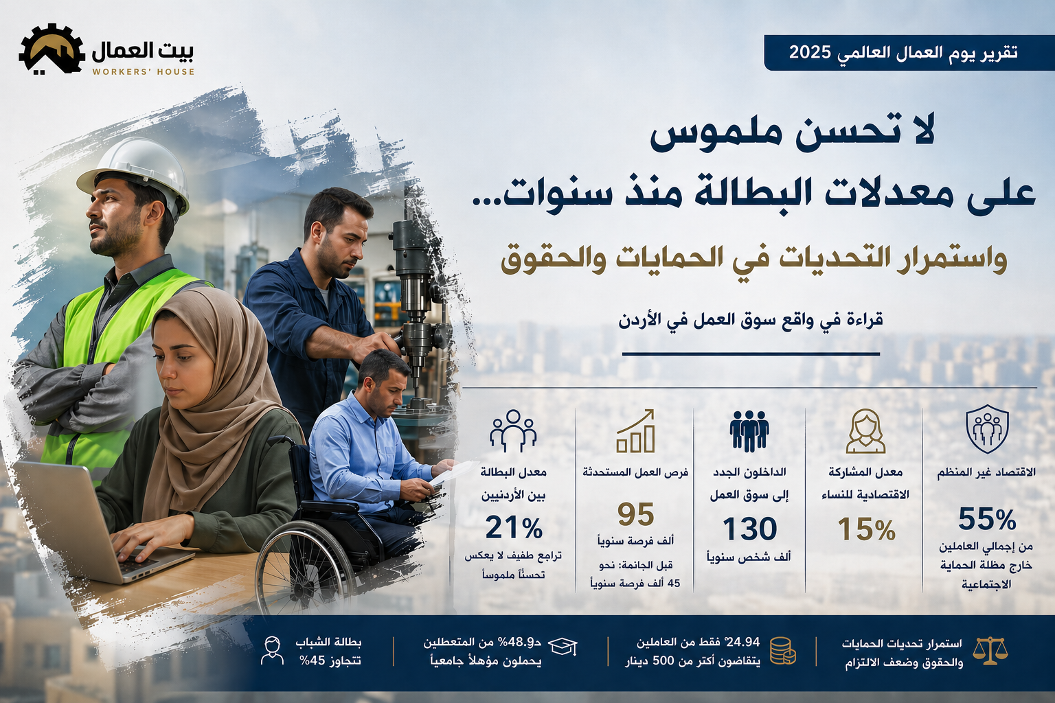 أصدر المركز الأردني لحقوق العمل "بيت العمال" تقريره بمناسبة يوم العمال العالمي، كاشفاً عن مفارقة في سوق العمل، حيث ما تزال معدلات البطالة بين الأردنيين تزيد على 21% منذ سنوات ما بعد الجائحة، رغم ارتفاع عدد فرص العمل المستحدثة إلى ما يقارب 95 ألف فرصة سنوياً، في وقت يقدر فيه عدد الداخلين الجدد إلى سوق العمل بنحو 130 ألف شخص سنوياً.